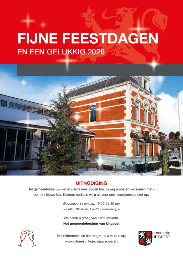 Gemeente Uitgeest nodigt u van harte uit om woensdag 14 januari 2026 het Nieuwjaarsconcert bij te wonen. Een avond om samen het nieuw jaar in te luiden, vol muzikale verrassingen en gezelligheid.